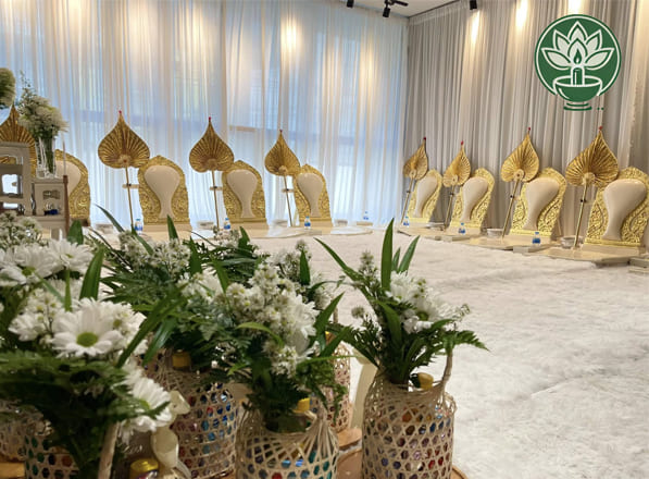 – ดอกไม้ พานพุ่ม ธูปเทียน แป้งเจิม สายสิญจน์ แผ่นทองมีให้ครบครัน
