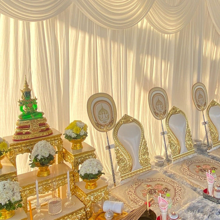 – ดอกไม้ พานพุ่ม ธูปเทียน แป้งเจิม สายสิญจน์ แผ่นทองมีให้ครบครัน